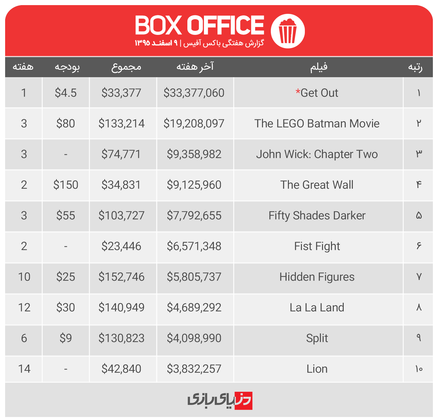 خانه » سینما و تلویزیون گزارش باکس آفیس: ترسناکِ جدید هالیوود لگوها را کنار زد! × توسط امیرحسین صفری در ۱۳۹۵/۱۲/۱۰ , 12:08:16 1 هفتهای که گذشت از لحاظ حضور تازهاکرانها چندان هفتهی پربار و پر رونقی نبود، با این حال جدول دستخوش تغییراتی شد که از جمله شاخصترین آنان، پایان یافتن صدر نشینی دو هفتهایِ فیلم «بتمن لگویی» بود. این هفته با اکران ترسناکِ «برو بیرون» (Get Out)، بتمن بالاخره پس از دو هفته حضور در صدر به زیر آمد و عنوان یکِ جدول فروش را به برو بیرون واگذار کرد. فیلم برو بیرون این هفته افتتاحیهی خود را با رقمِ ۳۳ میلیون دلار آغاز کرد؛ برو بیرون تا کنون و در مجموع آرای کاربران IMDB، نمرهی قابل قبولِ ۸ را دریافت کرده و چنان که معلوم است، با یک ترسناکِ کم خرجِ خوب طرف هستیم. این فیلم که با هزینهای در حدود ۴ و نیم میلیون دلار به تولید رسیده است، داستان یک نوجوان آفریقایی به نام «کریس» را روایت میکند. کریس بعد از گذشت مدتی از مراسم نامزدیاش به دیدار خانوادهی همسرش میرود. در منزل خانوادگیِ «رُز» (نامزد کریس) ابتدا همه چیز بهنظر خوب و مرتب است. با گذشت زمان اما به تدریج حقایقی شروع میکنند به آشکار شدن. فیلم احساسات آشفته، نگران و وحشتزدهی کریس را به نمایش میگذارد. Get Out یا ظهور و صدرنشینی برو بیرون، این هفته بتمن لگویی و قسمت دوم اکشنِ «جان ویک» بهعنوان دو پرفروش سینماهای آمریکا هر کدام با یک پله سقوط در جایگاه دوم و سوم قرار گرفتند. بتمن این هفته ۱۹ میلیون دلار به مجموع خود اضافه کرد تا در جمعِ فروش داخلی به ۱۳۳ میلیون دلار دست پیدا کند. جان ویک هم این هفتهاش را با ۹ میلیون دلار به پایان برد و به مجموع ۷۴ میلیون دلار دست پیدا کرد. The Great Wall در ادامهی جدول، فیلم «دیوار بزرگ» هم در راستای ناکامیِ دور از انتظار هفتهی گذشته، این هفته با بیش از ۵۰ درصد افت فروش مواجه گردید. به این ترتیب ۹ میلیون دلار فروخت و ۳۴ میلیون دلاری شد. هزینهی تولید دیوار بزرگ ۱۵۰ میلیون دلار است که البته مبلغی در حدود ۱ و نیم برار آن از بازارهای جهانی خصوصاً چین به دست آمده و فروشِ ضعیف آمریکا جای نگرانی چندانی ندارد. در ادامه جدول فروش هفته را مشاهده میکنید: (۹ اسفند ۹۵) نویسنده امیرحسین صفری دبیر دپارتمان فیلم و تلویزیون در رسانه دنیای بازی | نویسنده، مترجم و تحلیلگر سینما و تئاتر | علاقهمند به بازیهای ویدئویی | طراح گرافیک لینک منبع سینما و تلویزیون 1 دیدگاه ثبت شده است دیدگاهتان را بنویسید لغو پاسخبرای ارسال دیدگاه باید وارد شوید بیچاره مت دیمن ۰۰ پاسخ