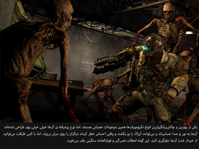 خانه » مسابقات بازی نقد بازی «فضای مردهی ۳»؛ یک مرگ وحشتزای تلخ × توسط سعید زعفرانی در ۱۳۹۱/۱۲/۰۸ , 22:09:57 154 یک مرگ وحشتزای تلخ A Scary Bitter Death وقتی یک بازی به اصالت خود پشت پا میزند فضای مردهی اول را حتی وقتی در حضور دو یا سه نفر دیگر هم بازی میکردیم، وحشت تمام وجودمان را فرا میگرفت. شما با هر قدمی که بر میداشتید نگران بودید که یک موجود ترسناک بدقواره ظاهر شود و مدام عکسالعمل احتمالی خود هنگام رویارویی با آن را مرور میکردید. حتی، زمانهایی که در یک محیط کاملا روشن، با دغدغهی حل کردن یک معما، برای یافتن خروج یا به کار انداختن یک ژنراتور و شاید هم رفتن به طبقهای دیگر در تلاش بودید، همیشه یک گوشهی ذهنتان را به نشان دادن واکنش سریع در صورت ظهور احتمالی نکرومورفهای ترسناک و گوشهای دیگر را به مهمات و خط سلامت «آیزاک» (این مهندس بیچارهی فلک زده) اختصاص میدادید. به راستی که چه بازی انقلابی و پیشآهنگی در سبک افول کردهی وحشتبقا خلق شده بود. و چه مرگ وحشتزای تلخی داشت. در کنار این مسئله که فضای مردهی سوم اصلا در حد و اندازههای دو قسمت قبلی خود نیست، این بازی ایرادات قائم به ذاتی هم دارد که بیشتر به بخش داستانی و روایی بازی برمیگردد. روایتی که در گذشته دستمایهی خوبی برای ترساندن شما بود و به راحتی به دغدغهی فکری بازیکننده تبدیل میشد، اما در این قسمت، به شدت افت کرده و از این حالت خارج شده است. به همین دلیل، بخش اعظمی از این نقد را به بررسی داستان و روایت بازی اختصاص دادیم. این نوشته به همین علت ممکن است بخشهایی از داستان بازی را فاش کند. نقد و بررسی تماما برای بخش داستانی تک نفرهی بازی نوشته شده است و هیچ اشارهای به بخش همکاری نشده. مجموعهی ایرادها Body of Faults شروع خوب فضای مردهی ۳ با یک فضاسازی درست، یک پیشزمینهی کاملا حسابشده از اتفاقات بازی به بازیکننده میدهد که برای کلید خوردن قصه کافی است. اما در ادامه، داستان با افت شدیدی روبرو میشود که در ریتم، نوع روایت و سناریوهای بازی هم دیده میشود. کلیت داستانی بازی هم به اندازهی کافی درگیرکننده نمیشود و به دلیل عدم شخصیتپردازی درست، عدم پرداخت درست روابط بین شخصیتها (مخصوصا «آیزاک» و «الی») و فقدان هرگونه توجیه تغییرات مسیر داستان؛ داستان بازی به یکی از کلافهکنندهترین کلافهای سردرگم بازیهای رایانهای تبدیل میشود. متاسفانه، بسیاری از ضعفهای داستانی بازی، به گیمپلی و روند کلی آن نیز رخنه میکنند و تاثیر منفی به شدت مخربی در این بخش هم میگذارند. فلش بک ابتدای بازی از عهدهی طرح مسئلهی کلی بر میآید. در ادامهی داستان، خط اصلی روایت بر اساس تحقیقات «دکتر سرانو» شکل میگیرد و برای توجیه ضرورت ادامهی این روند، یک نیروی محرک به بازی اضافه شده است که همان دشمنان انسانی بازی هستند. در چپتر آغازین بازی با سه شخصیت کلیدی جدید آشنا میشویم که علیرغم سیر اتفاقاتی که تا پایان برایشان میافتد، تا آخر بازی جدید باقی میمانند! شخصیت منفی بازی یعنی «جیکوب دنیک» به هیچ عنوان شخصیت پردازی نمیشود. تنها در مراحلی از بازی به هدف او و باورش اشاره میشود که تنها میتواند به سویهی دیگری از داستان بازی عمق ببخشد و آن را از سطح اتفاقات پشت سر هم و بی دلیل خارج کند. اما، به شکل گیری شخصیتی او کمکی نمیکند. شخصیت پردازی «کارور» و «نورتون» بسیار ضعیفتر است. با این که مدت زیادی از روند بازی را در کنار شخصیت «کارور» هستیم، اما چیزهای زیادی از او نمی دانیم. حرفهای بسیار کمی از او میشنویم و تعلق خاطر بسیار ناچیزی به او پیدا میکنیم. «کارور»، نمونهی کامل یک تیپ مقوایی است. به همین دلیل، وقتی در اتفاقات داستان بازی تاثیرگذار میشود، آن اتفاق حس بسیار ناچیزی به بازیکننده منتقل میکند. همین اتفاق برای «نورتون» با شدت بیشتری افتاده است. ظاهرا سازندگان قصد داشتهاند تا با ایجاد یک رابطهی به ظاهر عاطفی بین «الی» و «نورتون» بازیکننده را وادار به موضع گیری در برابر او کنند تا خیانت او به گروه و رفتار احمقانهی «آیزاک» د