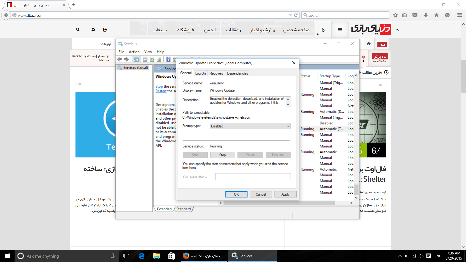 خانه » مقالات بازی آموزش تصویری: چگونه آپدیتهای ویندوز ۱۰ را غیرفعال کنیم؟ × توسط سورنا رضایی در ۱۳۹۴/۰۵/۲۹ , 16:00:47 8 در ویندوز ۱۰ این قابلیت بصورت مستقیم وجود ندارد که بتوانید دانلود و نصب آپدیتها را فعال یا غیر فعال کنید و این در حالیست که در نسخههای قبلی ویندوز کاربران این قابلیت را داشتند که با ورود به بخش تنظیمات آپدیت آن را غیرفعال کنند. شاید دلیل این امر را میتوان در این مسئله جستوجو کرد که شرکت مایکروسافت میخواهد از نصب آپدیتها و ویژگی های جدید ویندوز توسط کاربران مطمئن شود. حال اگر ویندوز ۱۰ را بهتازگی تصب کرده اید و نگران حجم اینترنت محدود خود هستید و میخواهید نصب آپدیتهای اجباری را غیر فعال کنید، میتوانید از روش ارائه شده در دنیای بازی استفاده کنید که با این روش مشکل شما بهکلی برطرف خواهد شد. مرحله اول: در بخش جستجو “Services” را بیابید و اجرا کنید. مرحله دوم: پس از اجرای برنامه Sevices، بخش Windows Update را بیابید و پنجره مربوط به آن را باز کنید. مرحله سوم: حال تنظیمات مربوط به هر بخش را مانند تصویر زیر تغییر دهید، بروی گزینه Stop و پس از آن Apply کلیک کرده و پنجره را ببندید. مرحله چهارم: حال به بخش Windows Update در بخش Setting مراجعه کنید و اگر با پیام زیر مواجه شدید، کار دیگر تمام شده است! توجه: اگر زمانی قصد داشتید تا ویندوز خود را آپدیت کنید، میتوانید دقیقا عکس این مراحل را انجام دهید. در پایان امیدواریم با روش ارائه شده در سایت دنیای بازی از آپدیتهای ویندوز ۱۰ خلاص شده باشید! نویسنده سورنا رضایی زمین کتابی است و ما واژههای آن که با هم داستان زندگی زمینیان را مینویسیم پی سی گیمینگ (PC Gaming)سیستم عامل Windows 10 مقالات بازی 8 دیدگاه ثبت شده است دیدگاهتان را بنویسید لغو پاسخبرای ارسال دیدگاه باید وارد شوید ممنون بابت مقاله کاربردی و خوبتون ۰۰ پاسخ گویا این کار را کردن که مانع از اجرا بازیهای کرکی و نرم افزارها بشن.حالا که چی :۱۲: بعضی ها هستن که نمیتونند همه چیز را اصل بخرن به ویژه مردم کشورهای جهان سوم مثل ایران که در امدها پایین و خرجها زندگی زیاد . ۰۰ پاسخ مرسی ممنون بابت آموزش خوب و کاربردی ۰۰ پاسخ هر کامنتی که قرار میدم Your comment is awaiting moderation جلو چشمام ظاهر میشه دلیلش رو هم نمیدونم کلافه شدم اقا جون مادرتون رفع کنید این مشکل رو ۱۰۰ بار درخواست کردیم .. ۰۰ پاسخ ممنون ولی به هیچ وجه این روش خوبی نیست چون با این روش Store غیر فعال میشه و نمیتونید از استور اپ یا گیم بگیرید. بهترین روش برای غیر فعال کردن آپدیت ویندوز ۱۰ : از طریق وارد کردن دستور gpedit.msc در Run ( روش Local Group Policy Editor ) و مسیر زیر Computer Configuration/Administrative Templates/Windows Components/Windows Update بعد از راست کلیک روی Configure Windows Updates و انتخاب ادیت گزینه های زیر پیش زوی شماست: کافیست Disabled را انتخاب کنید و برای بازگرداندن به حالت اولیه ویندوز در تصویر فوق Not Configured را انتخاب کنید. ۰۰ پاسخ غیر فعال کردن آپدیت ویندوز ۱۰ بنحوی که Store از کار نیفته: forum.soft98.ir/post612206.html#post612206 ۰۰ دوست گرامی تو ویندوز ۱۰ بجای gpedit.msc از Services.msc استفاده میشه…وبعد Update Orchestrator Service در ادامه کافیه گزینه stop رو انتخاب برای باز گردانی به قبل هم همین مراحل و در اخر روی گزینه start رو انتخاب میکنیم. ۰۰ سلام تشکر از این مطلب خوب و کاربردی… :pc: همیشه شاد و همیشه خوش باشید :pc: ۰۰ پاسخ نمایش بیشتر