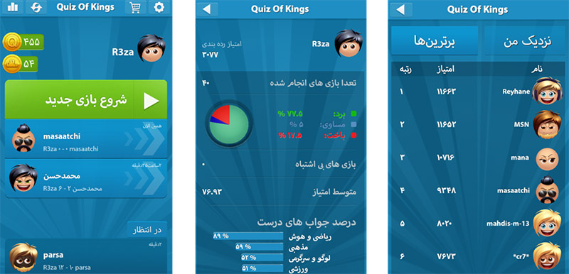 خانه » مقالات بازی معرفی بازی جدید و ایرانی Quiz Of Kings × توسط دنیای بازی در ۱۳۹۴/۰۷/۱۴ , 15:01:24 5 اگر از علاقمندان رقابت و هیجان و همچنین بالابردن اطلاعات خود هستید، با معرفی بازی جدید و ایرانی Quiz Of Kings همراه باشید. Quiz of Kings یک استارتاپ ایرانی است که توسط گروهی از دانشجویان دانشگاه امیرکبیر ساخته شدهاست. این بازی در سبک رقابتی-معمایی (Trivia) میباشد؛ سبکی که این اواخر بسیار محبوب شده و نظر میلیونها کاربر را از سرتاسر دنیا به خود جلب کردهاست. اما با وجود محبوبیت فراوان این بازیها در بین کاربران ایرانی، یکی از مشکلاتی که این کاربران همیشه با آن روبرو هستند، این است که سؤالات موجود در این بازیها چندان مناسب با جامعه ایران نبوده و پاسخدادن به آنها کار بسیار دشواری است و کاربر ایرانی اطلاعات زیادی در مورد آنها ندارد. Quiz Of Kings اما با این که از لحاظ کیفی در سطح بازیهای بزرگ این سبک همچون QuizUp و Trivia Crack قرار دارد، سؤالات آن مخصوص کاربران ایرانی طراحی شده است و طیف بسیار وسیعی از سؤالات گوناگون را در بر میگیرد. در بازی Quiz Of Kings، مهمترین تاکید سازندگان بر روی موضوعات و تنوع سؤالات بودهاست. نسخه اولیه Quiz Of Kings شامل ۳۰ هزار سوال مختلف در ۱۵ موضوع کلی از جمله لوگو و سرگرمی، ورزش، سینما، اطلاعات عمومی، مذهبی، تاریخ، علمی، فوتبال و … است و قرار است با هر بهروزرسانی سؤالات بیشتری به مجموعهی سؤالات اضافه شود. به گفته تیم سازنده، تاکید آنها بر روی بالابردن سطح دانش و اطلاعات عمومی کاربران بوده است. این بازی یک بازی آنلاین دو نفره و رایگان در محیطی به شدت رقابتی است و شما همزمان میتوانید با چندین نفر به رقابت بپردازید، برای دوستانتان دعوتنامه بفرستید و آنها را به مبارزه دعوت کنید و در صورت باخت از آنها انتقام بگیرید. همچنین میتوانید با یک حریف تصادفی از بین سایر کاربران به مسابقه بپردازید، برای آنها درخواست دوستی بفرستید و اطلاعات خود را به چالش بکشید. در پایان، اگر به فضای رقابتی و آنلاین علاقهمندید، دانلود بازی Quiz Of Kings را حتماً به شما توصیه میکنیم. این بازی در آیندهای نزدیک قطعاً به یکی از رقبای جدی بازیهای مطرح جهانی در این سبک تبدیل خواهد شد و سؤالات انحصاری و بومی Quiz Of Kings قطعاً آن را به گزینه اول کاربران ایرانی تبدیل خواهد کرد. دانلود بازی Quiz Of Kings از کافه بازار نویسنده دنیای بازی وبسایت خبری تحلیلی دنیای بازی Quiz Of Kingsگوشی موبایل - Mobile Phones (Smart Phones) مقالات بازی 5 دیدگاه ثبت شده است دیدگاهتان را بنویسید لغو پاسخبرای ارسال دیدگاه باید وارد شوید بازی قشنگیه واسه سوگلیهاونورچشمی هاشون.متاسفم ازاینکه چرامسدودنمیشه این بازی مخرب. ۵۸ پاسخ ۰۹۹۳۳۲۰۱۴۹۶ ۷۸ پاسخ بازی جالبی هست سرگرم کننده هست به درد اوقات بیکاری میخوره ۲۵۱۵ پاسخ منم خوشم نیومد چون نسخه ی ویندوزفون نداره ۲۲۲۷ پاسخ خوشم نیومد البته نظر شخصیمه ۳۶۱۹ پاسخ