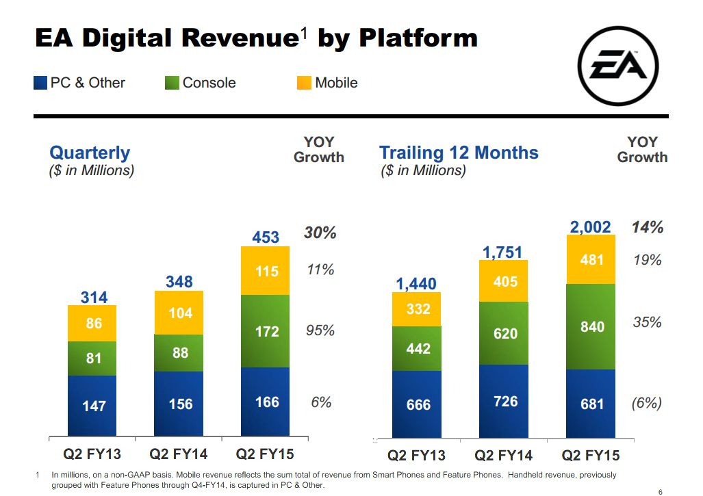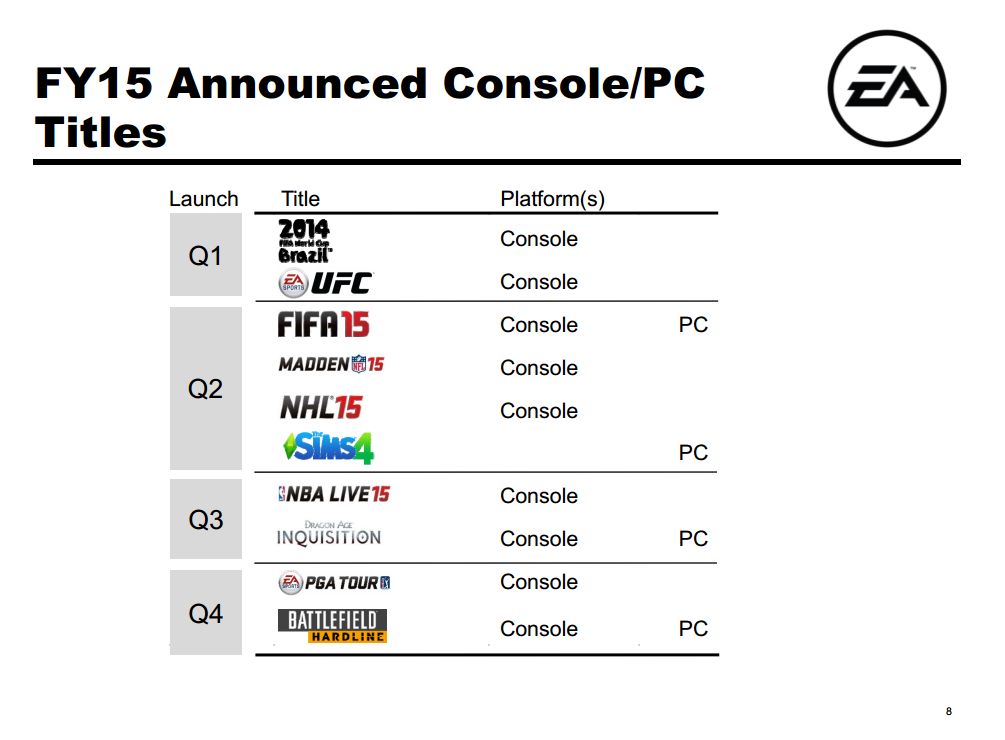 خانه » اخبار بازی تاریخ انتشار Battlefield Hardline مشخص شد × توسط میلاد جهاندار در ۱۳۹۳/۰۸/۰۷ , 10:02:22 12 شرکت EA به تازگی تاریخ انتشار دقیق عنوان Battlefield Hardline و یک بازه زمانی برای انتشار Star Wars Battlefront مشخص کرد. عنوان Battlefield Hardline در ۱۷ مارس در امریکا و ۱۹ مارس در اروپا منتشر می شود. این بازی برای PC,PS4,PS3,XBOX ONE,XBOX 360 منتشر خواهد شد. EA همچنین اعلام کرده عنوان Star Wars Battlefront در تعطیلات ۲۰۱۵ منتشر خواهد شد و در ابتدا ما بهار ۲۰۱۵ را برای انتشار برنامه ریزی کرده بودیم. این شرکت همچنین طی کنفرانس مالیش اعلام کرده است عنوان بعدی Battlefield تا تعطیلات ۲۰۱۶ منتشر نخواهد شد. مدیرعامل شرکت EA آقای Blake Jorgensen در رابطه با تاریخ انتشار Battlefield بعدی بیان کرد: این به ما اجازه می دهد تا هرسال یک عنوان شوتر اول شخص بزرگی داشته باشیم. این شرکت بیان کرده که برای سه ماهه منتهی به ۳۰ سپتامبر ۲۰۱۴ شرکت EA ناشر شماره یک در فروش عناوین PS4,XBOX ONE با بازیهای FIFA 15, NHL 15, Madden NFL 15, EA Sports UFC, Titanfall, Battlefield 4 و FIFA 14 شده است. آقای Blake Jorgensen همچنین درباره سیستم EA Access اعلام داشته که بیش از انتظارات ظاهر شد. EA گفت در طول سه ماهه بازیکنان کنسول و PC حدود ۱.۹ میلیارد ساعت بازی کرده اند و کاربران فعال تلفن های همراه ماهانه نیز ۱۵۵ میلیون نفر هستند. همچنین بازیهای ورزشی موبایلی EA نیز در نیمه دوم سال جاری بیش از ۴۰ میلیون کاربرفعال ماهانه داشته که نسبت به سال قبل ۲۵۰ درصد افزایش داشته است و این عناوین شامل Madden NFL Mobile و FIFA 15 Ultimate Team Mobile هستند. تا به امروز ۸۹ میلیون بار نیز بازیکنان بازی Madden NFL 15 را اجرا کردند که نسبت به سال قبل ۴۰ درصد افزایش داشته است. برای سه ماهه سوم درآمد خالص شرکت ۱میلیارد و ۲۲ میلیون دلار بوده که این درآمد شامل درآمد خالص از FIFA, Madden NFL و Hockey Ultimate Team می گردد که نسبت به سال قبل افزایش ۹۶ درصدی داشته است. شما در ادامه می توانید تصاویری از آمار و ارقام نموداری که EA منتشر کرده مشاهده کنید: منبع نویسنده میلاد جهاندار Battlefield Hardlineبازی فیفا موبایل (FIFA Mobile)پی سی گیمینگ (PC Gaming)کنسول Xbox 360کنسول Xbox One 12 دیدگاه ثبت شده است دیدگاهتان را بنویسید لغو پاسخبرای ارسال دیدگاه باید وارد شوید اصلا از این شماره خوشم نیومد یعنی چی برا چی اصلا اینو میسازن! این شماره رو من بتل نمیدونم ! اصلا ! چند وقتیه ea عشقم شده! فقط بخاطر بتل ! امیدوارم واقعا بتل ۵ در کار باشه تو سال ۲۰۱۶ اصلا تصور گرافیک و مولتیش سخته! :۱۵: :۱۵: تا اون موقع همیشن بتل ۴ رو میخوریم :۱۵: :۱۵: ولی در مورد هاردلاین :۲۳: ۰۰ پاسخ “اصلا تصور گرافیک و مولتیش سخته!” چقدر این جمله آشنا بود! :lol: :24: ۰۰ چرا؟ :۲۳: ۰۰ آخه من تو پست قبلی مربوط به بتل دقیقا همینو گفته بودم! :lol: ۰۰ عجب! :lol: :lol: ۰۰ خیلی نامردی همین الان میخواستم اواتارمو این بزارم :lol: ۰۰ چه جالب.گویا قراره دیگه ندای وظیفه و فرقه اسسین ها تنها بازی های سالیانه نباشن. ۰۰ پاسخ فروش ها نوش جونش! :۱۵: :۱۵: چندوقتیه مورد انتظاترین بازی من همین بتلفرانته…اون تریلر E3 امسالش دیوونم کرد!چه کارا که بر و بچ دایس داشتن واسه ساخت این بازی میکردن! :۱۵: وحشتناک منتظرشم! :۱۵: :۱۵: ۱۰ پاسخ هاردلاین هم اگر میخواد مثل بتاش باشه میخوام اصلا منتشر نشه!تا ۲۰۱۶ با همین بتل ۴ زندگی میکنیم! ۰۰ خداییش این دگ زده تو جاده خاکی! اون ۲۰۱۶ بنظرم الکیه! امکان هم نداره! ۰۱ سه ماه دیگه ۰۰ پاسخ رفته تو مایه نید فور اسپید ۱۰ پاسخ نمایش بیشتر