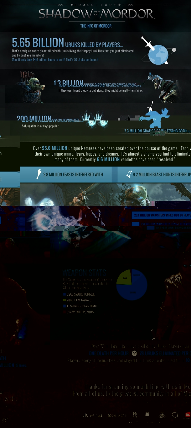 خانه » اخبار بازی با تصویری اینفوگرافیکی از عملکرد بازیکنان در Shadow of Mordor همراه باشید × توسط میلاد جهاندار در ۱۳۹۳/۱۲/۰۵ , 17:00:20 6 استودیو Monolith به تازگی تصویری اینفوگرافیکی از عملکرد بازیکنان در عنوان نقش آفرینی Middle-Earth: Shadow of Mordor که شامل اطلاعات جالبی است منتشر کرد. برای مشاهده ادامه خبر با دنیای بازی همراه باشید. عنوان نقش آفرینی Middle-Earth: Shadow of Mordor ساخته استودیو Monolith برای پلتفرم PC،PS4،XBOX ONE،XBOX 360،PS3 بوده که در اکتبر سال ۲۰۱۴ از سوی شرکت Warner bros عرضه شد. به تازگی این استودیو تصویری اینفوگرافیکی منتشر کرده که اطلاعات جالبی از عملکرد بازیکنان را شامل می شود. براساس تصویر تاکنون بیش از ۷۴.۶ میلیون ساعت بازیکنان Middle-Earth: Shadow of Mordor را بازی کردند. همچنین آنها بیش از ۵.۶۵ میلیارد اورک را کشته و ۲۰۰ میلیون تن از آنها را تحت تسلط خود درآورند. لازم به ذکر است که جدیدترین بسته الحاقی این بازی به نام The Bright Lord در تاریخ ۱۰ مارس امسال منتشر خواهد شد. شما می توانید در ادامه تصویر را مشاهده کنید: نویسنده میلاد جهاندار Middle-Earth: Shadow Of MordorMonolithپی سی گیمینگ (PC Gaming) لینک منبع 6 دیدگاه ثبت شده است دیدگاهتان را بنویسید لغو پاسخبرای ارسال دیدگاه باید وارد شوید برو باباThe Bright Lord امروز منتشر میشه ۱۰ مارس کجا بود ۱۰ پاسخ بازیه خوبو خوش ساختی بود. وقتی خریدم اصلا انتظار بازی به این خوبیو نداشتم سیستم نمسیسش بنظرم نو اوریه خوبی بود شماره دوشو بسازن بازیه کاملی میشه :۱۵: ۳۰ پاسخ واقعا بازی شاهکاری بود از همه لحاظ ۰۰ پاسخ خدایی من ۴۸ ساعت وقت صرف بازی کردم به سرعت باد گذشت این تایم بازی به این میگن ! قشنگ تو رو توی دنیای خودش غرق کنه ! هرچند هنوزم باهاش مشکل دارم ! ۲۰ پاسخ به نظر خودم فقط شخصیت پردازی و صداگذاریش عالی بود ( البته از تروی بیکر کم تر از این هم انتظار نمیرفت) ۰۰ جالب بود ۴۳ پاسخ نمایش بیشتر