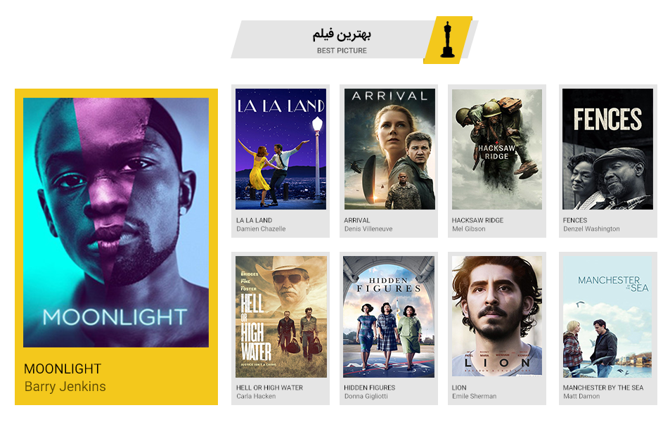اسکار بی خودی بود با نامزدای بی خود بهترین فیلم سال جوک تاریخ بشریته! در کل به شدت سیاسی بود و بنظرم بیشتر سیاست به هنر تقدم داشت تویه مراسم از اسکار فرهادی هم صد در صد حمایت می کنم ولی نظر مثبتی درباره ی فیلم ندارم ، به هر حال خوشحالم از ایران یه بار دیگه یکی اسکار گرفت حالا چه حق چه نا حق چیزی با حرف زدن ما عوض نمیشه پس بیاین باهاش کنار بیایم و خوشحال باشیم بابتش تا اینکه مانع خوشحالی بقیه بشیم و بقیرو احمق و سینما ندون فرض کنیم، به هر حال جو همیشه یک طرفه هست و از کشوری که ضرب المثل معروفشون همرنگ جماعت شو هست چیزی بیشتره این انتظار نمیره، به هر حال خوشحالم که فرهادی دومیم گرفت واقعا در حق ارایول ظلم شد باید حد اقل۳ تا اسکار میگرفت ! مسخره ترین حرکت اسکار هم کاندید نکردن اما واتسون بود دو فیلم خیلی خوب بازی کرده بود و واقعا شایسته بود بهترین بازیگر زن باشه یا حد اقل نامزد شه! جایزه های لالالند هم بسیار به جا بودن بهترین انتخاب هم به نظرم نقش اول مرد بود ، کیسی واقعا خودش یک تنه فیلم رو بالا می کشید و این حرکتش لیاقت اسکار رو داشت. در کل جزو بد ترین اسکار هایی بود که دیدم امید وارم سال بعد که فیلمای بزرگی میاد اسکار بهتری داشته باشیم پ.ن: همین که سایلنس نامزد چیزی نشد بزرگترین ضعف اسکار امسال بود، هست، و خواهد بود ۱۱ پاسخ