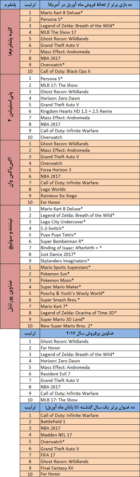 خانه » اخبار بازی ۱۰ بازی برتر از لحاظ فروش ماه آوریل در آمریکا × توسط فرشاد زمانی در ۱۳۹۶/۰۳/۰۲ , 12:00:10 0 گروه انپیدی اخیراً گزارشی مبنی بر پرفروشترین بازیهای ماه آوریل سال ۲۰۱۷ در آمریکا منتشر کرده است. در ادامه همراه دنیای بازی باشید. بازی Mario Kart 8 Deluxe نینتندو در صدر لیست ۱۰ بازی پرفروش برروی کلیه پلتفرمها قرار گرفته است و بازیهای Persona 5 ،The Legend of Zelda: Breath of the Wild ،MLB 17 The Show و Ghost Recon: Wildlands نیز جایگاه دوم تا پنجم را به خود اختصاص دادهاند. در ادامه شاهد لیست کامل منتشر شده توسط گروه انپیدی خواهید بود. همانطور که میدانید، در هر ماه این لیست براساس دلار آمریکا ترتیبدهی و با فروش فیزیکی و دیجیتالی ناشرین ترکیب خواهد شد. گرچه موارد اعلامی در این خبر شامل کلیه پول در جریان صنعت بازیسازی در این کشور نخواهد بود. بصورت کلی، هزینههای رد و بدل شده شامل سخت افزار، بازیها، لوازم جانبی نشان دهنده افزایشی به میزان ۱۰ درصد و رسیدن به رقم ۶۳۶ میلیون دلار بوده است که از ماه نوامبر سال ۲۰۱۵ تا به امروز، برای اولین بار در تاریخ رشد متوالی را نشان میدهند. در ارتباط با سخت افزار، کنسول نینتندو سوئیچ بار دیگر در بالای لیست بهترین کنسول از لحاظ فروش قرار گرفته است و در ماه آوریل حدود ۲۸۰ هزار نسخه از این کنسول در سراسر آمریکا منتشر شده است. بازی Mario Kart 8 Deluxe در ماه آوریل بیش از ۴۶۰ هزار نسخه بصورت فیزیکی و بیش از ۹۰ هزار نسخه بصورت دیجیتالی فروش داشته است. نکته مهم در مورد این بازی، عرضه آن در تاریخ ۸ اردیبهشت ماه (۲۸ آوریل) است و گزارش گروه انپیدی تا پایان روز ۲۹ آوریل بوده است در نتیجه این تنها آمار فروش یک روز این بازی است. نکته جالب دیگر آن است که NES Classic در جایگاه دوم بهترین فروش آمریکا در ماه آوریل قرار گرفته است و نسبت به کنسولهای اکسباکس وان و پلیاستیشن ۴ عملکرد بهتری داشته است. بطور کلی در ارتباط با بازار سخت افزار، شاهد افزایش ۳۷ درصدی و رسیدن به مبلغ ۷۹۵ میلیون دلار بودهایم. از ماه آوریل سال ۲۰۱۱ تا به امروز میتوان گفت که در ماه آوریل سال ۲۰۱۷ شاهد رشد قابل توجه درآمدهای ناشی از سخت افزار در آمریکا بودهایم. فروش بازیها به میزان ۶ درصد افزایش و به رقم ۳۰۴ میلیون دلار رسیده است که در صدر جدول عناوین پرفروش شاهد حضور بازیهای Mario Kart 8 Deluxe و Persona 5 هستیم. مت پیسکاتلا از گروه انپیدی پیرامون ماه آوریل اعلام کرد: در ماه آوریل شاهد عرضه بازی Call Of Duty: Black Ops 2 کنسول اکسباکس ۳۶۰ برای قابلیت برگردان جانبی بودیم که امکان اجرای آن را برروی اکسباکس وان فراهم مینمود و در نتیجه منجر به حضور آن در لیست ۱۰ بازی برتر شد. بازی Persona 5 ماه آغازین بسیار خوبی را نسبت به هر عنوان Persona دیگر در تاریخ پشت سر گذاشته است. به عنوان بهترین بازی سال از نظر فروش نیز شاهد حضور بازی Ghost Recon: Wildlands در جایگاه اول و سپس بازی For Honor در جایگاه دوم هستیم. در نهایت، در ارتباط با فروش ابزار جانبی و گیمپدها شاهد افزایش فروش ۴ درصدی و رسیدن به مبلغ ۱۲۶ میلیون دلار هستیم که فروش کنترلر پرو کنسول نینتندو سوئیچ در صدر جدول فروش گیمپدهای ماه آوریل قرار گرفته است. عناوین مشخص شده با علامت ستاره در جدول زیر نشان دهنده عدم ترکیب میزان فروش دیجیتالی عنوان مورد نظر است. نویسنده فرشاد زمانی لینک منبع اخبار بازی دیدگاهتان را بنویسید لغو پاسخبرای ارسال دیدگاه باید وارد شوید