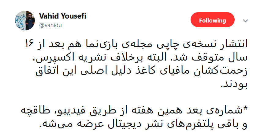 خانه » اخبار بازی مجله بازی نما آخرین مجله چاپی گیم ایران دیگر چاپ نمیشود × توسط آرش حکیمی در ۱۳۹۸/۰۷/۱۹ , 16:44:52 33 در سالهای اخیر سه مجله چاپی گیم ایران دانه دانه تعطیل شدند. اول بازیرایانه بود. بعد دنیای بازی بود که شهریور ۹۳ آخرین شمارهاش منتشر شد و با مهاجرت صاحبامتیاز مجله، انتشار چاپی مجله متوقف شد و فقط سایت دنیای بازی باقی ماند. در این مدت یعنی از سال ۹۳ تا الان ما همواره دلمان به این خوش بود که مجله بازی نما هنوز چاپ میشود. اما دقیقاً ۳۰ شهریور امسال بود که وحید یوسفی سردبیر بازینما در توییتر اعلام کرد که مجله بازی نما دیگر چاپ نمیشود و دلیلش هم مافیای کاغذ است. توییت وحید یوسفی اما چرا من بعد از بیست روز به فکر نوشتن این مطلب افتادم؟ چون دیروز بعد از مدتها تصمیم گرفتم یکی دو مجله چاپی بخرم فلذا سراغ نزدیکترین کیوسک مطبوعاتی رفتم. به دنبال دو تا مجله میگشتم، یکی کرگدن که تازگیها شنیده بودم جواد رسولی در آن مطلب مینویسد و یکی هم اندیشه پویا شماره ۶۰ که گویا با حسین علیزاده مصاحبه مفصلی کرده بود. قیمت مجلات البته که هیچکدام را پیدا نکردم اما موضوعی توجهم را جلب کرد. قیمت مجلات را که دیدم برق از سهفازم پرید. اندیشه پویا ۲۵۰۰۰ تومان، مجله ماشین ۱۲۰۰۰ تومان، مجله معمار ۲۰۰۰۰ تومان و همشهری جوان ۷۰۰۰ تومان. یادم هست وقتی که گرشاسپ منتشر شد همشهری جوان روی جلدش را به گرشاسپ اختصاص داد. فکر میکنم سال ۸۸ بود و همشهری جوان ۵۰۰ تومان قیمت داشت. الان بعد از گذشت ۱۰ سال قیمتش ۱۴ برابر شده. درعین حال هنوز هم ارزانترین مجله است. همان مجله کرگدن که گیرش نیاوردم ۲۰۰۰۰ تومان است. در یک سال گذشته مجلات زیادی تعطیل شدهاند و تعداد زیادتری هم نظم انتشارشان بهم خورده است. البته که وزارت ارشاد در صورت رعایت نکردن نظم انتشار مجوز را باطل میکند، اما آش این قدر شور بوده که فعلاً این قسمت از قانون را نادیده گرفته و به نظم انتشار کاری ندارد. به هر حال من از کیوسک یک همشهری جوان، یک خبر ورزشی و یک تکه لواشک خریدم و به خانه برگشتم. کاغذ و پایان تلخ رسانههای مکتوب مطالب اصلاً جذاب نبودند ولی فقط یک مطلب توجهم را جلب کرد. عنوان مطلب بود: کاغذ و پایان تلخ رسانههای مکتوب. مطلب را امین جوادی پویا نوشته بود و به شدت مطلب تلخ و غمانگیزی بود. آقای جوادی پویا شرایط فعلی رسانههای چاپی را بسیار لغزنده و به قول خودشان قرمز تشریح کرده بودند. حتی چند بار در متن اشاره شده بود که شاید این سطور که من الان دارم مینویسند هیچ وقت چاپ نشوند. یعنی سران نشریه نمیداند که شماره بعدی را میتوانند چاپ کنند یا نه. آقای جوادی پویا مشکلات نشریات چاپی را چند دسته کرده که اجمالاً برای شما تشریح میکنم. بینظمی در انتشار جوادی میگوید موضوع کمبود و گرانی کاغذ به قدری شدید است که حتی رسانههای دولتی و نیمه دولتی هم دچار مشکل شدهاند. نظم انتشار نشریات بهم ریخته به طوری که هفتهنامهها ماهنامه شده و ماهنامهها فصلنامه و گاهنامه شدهاند و وزارت ارشاد هم فعلاً به نظم انتشار کاری ندارد. بیکاری روزنامهنگاران روزنامهنگاران به دلیل مشکلات مالی از نشریات رفتهاند و کارهای دیگر مثل رانندگی در اسنپ و غیره میکنند. صفحهفروشی در نشریات نشریات برای این که مشکلات مالیشان را حل کنند رو به فروختن روی جلد و صفحات داخلی کردهاند. جلد روزنامههای پرتیراژ سیاسی حدود ۵۰ میلیون تومان و مجلات و روزنامههای کمتیراژتر ۱۰ تا ۳۰ میلیون تومان فروخته میشود. نوسان قیمت کاغذ اما مهمترین قسمت مقاله که اتفاقاً باعث تعطیلی نسخه چاپی بازینما هم شد را عیناً از مجله همشهری جوان برایتان نقل میکنم: نوسان قیمت کاغذ در بازار به قدری عجیب بود که هیچ محصولی را نمیتوان با آن مقایسه کرد. به طور مثال کاغذ گلاسه در تیرماه ۹۷ تقریباً کیلویی ۴۰۰۰ تومان بوده، در مهرماه ۱۴۰۰۰ تومان، در بهمن ماه ۲۲۰۰۰ تومان و در اسفند ۳۵۰۰۰ تومان. قیمت فعلی این کاغذ تا لحظه نگارش ۱۸۰۰۰ تومان است نوساناتی که از نوسان قیمت دلار ه