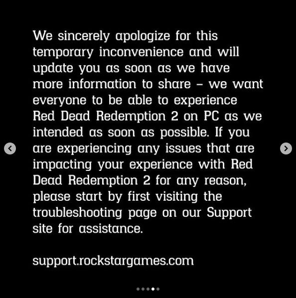 در اکانت رسمی توئیتر این استودیو، راک‌استار اظهار نظری طولانی در مورد این وضعیت ارائه داد. استودیو با اشاره به وضعیت کنونی اشاره کرد که آن‌ها در مورد مشکلات برخی از کاربران نسخه PC بازی اطلاع دارند و قول دادند که اصلاحات و بروزرسانی‌های بیشتری را برای حل آن‌ها ارائه کنند. همچنین این استودیو توصیه کرد که درمواقع موردنیاز از بخش پشتیبانی وبسایت، مشکلات خودشان را گزارش کنند. گفتنی است که طی اعلامیه قبلی هم راک‌استار اعلام کرده بود که بخش پشتیبانی آن‌ها کاملا به‌روز است و علاوه بر گرفتن فیدبک از جانب بازیکنان، مدام گزارشی از بروزرسانی‌ها و حل مشکلات ارائه خواهد داد.