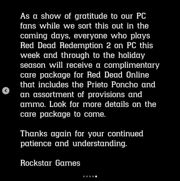 این بیانیه خوب به‌نظر می‌رسد، اما اطلاعاتی در مورد بازه زمانی ارائه این بروزرسانی‌ها و پچ‌ها بروز نمی‌دهد. به‌نظر می‌رسد که بازیکنان نسخه PC این بازی، طی تعطیلات پیش‌رو می‌توانند به‌عنوان تلافی مشکلاتی که تحمل کرده‌اند، یک بسته ویژه برای Red Dead Online با نام Prieto Poncho دریافت کنند. این بسته شامل مجموعه‌ای از مقررات و مهمات اضافه خواهد بود.