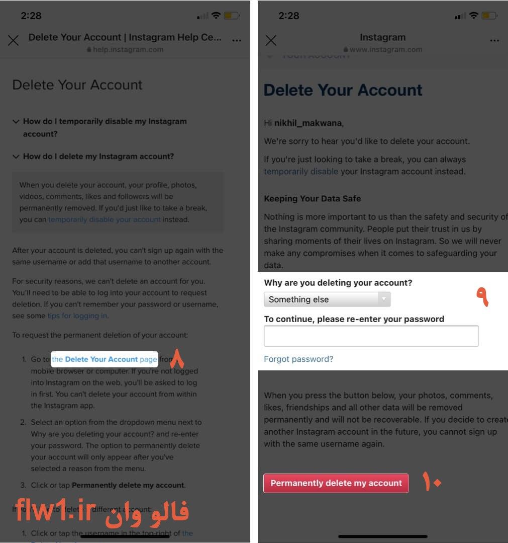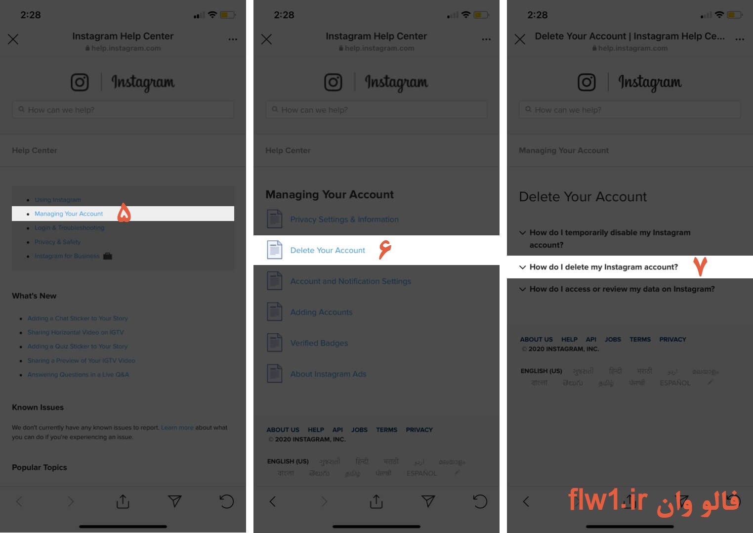 خانه » گزارش آگهی گام به گام دیلیت اکانت اینستاگرام + یک نکته مهم قبل از حذف پیج × توسط واحد تبلیغات در ۱۴۰۰/۱۰/۳۰ , 13:04:22 0 شاید به دلایلی تصمیم گرفته باشید اکانت خود را برای همیشه حذف کنید، اگر از این کار مطمئن هستید لازم است که فرایند دیلیت اکانت اینستاگرام رو انجام دهید. برای دیلیت کردن اکانت، باید چند مرحله را طی کنید تا حساب شما برای همیشه حذف شود. اما پیش از هر اقدامی، باید به شما هشدار بدهیم که بهتر است قبل از حذف اکانت از تصمیم خود مطمئن باشید. زیرا پس از حذف اکانت (Delete Instagram Account) تمام اطلاعات، عکسها، کامنتها و غیره، برای همیشه پاک خواهند شد و دیگر نمیتوانید دوباره پیجی با همان نام کاربری بسازید. البته توجه داشته باشید که اینستاگرام از ابتدای سال ۲۰۲۱ با قرار دادن مهلت یک ماهه، امکان بازگردانی پیجهایی که کاملاً حذف شدهاند را تا مهلت تعیین شده، فراهم کرده است. پس قبل از هر اقدامی، تمام جنبههای این قضیه را بررسی کنید و سپس اقدام کنید و اگر متوجه شدید که قصدتان برای ترک اینستاگرام موقتی است. پیشنهاد میکنیم به جای حذف حساب، اکانتتان را حذف موقت یا دی اکتیو کنید. به خاطر اینکه ممکن هست این فرایند کمی گیج کننده باشد، در این مقاله، فالو وان با آموزش گام به گام حذف دائمی اکانت اینستاگرام از طریق گوشی، همراه شماست، تا پایان این مقاله با ما همراه باشید. دیلیت اکانت اینستاگرام به طور دائم تا همین چند وقت پیش، حذف دائمی اکانت تنها از طریق کامپیوتر امکانپذیر بود. اما اکنون با آپدیت اینستا، امکان دیلیت اکانت اینستاگرام از طریق موبایل نیز در دسترس کاربران قرار گرفته است. دیلیت اکانت اینستاگرام از طریق موبایل گام اول ابتدا وارد صفحه اصلی حساب خود در اینستاگرام شوید و سپس روی منوی (سه خط موازی) در گوشه بالای سمت راست صفحه بزنید. گام دوم این منو وارد بخش تنظیمات (Settings) شوید. گام سوم در این مرحله گزینه (Help) را انتخاب کنید. گام چهارم همانطور که در تصویر زیر مشاهده میکنید، بخش (Help) سه گزینه دارد که از بین آنها باید گزینه (Help Center) را انتخاب کنید. گام پنجم بعد از انتخاب گزینه (Help Center) ، صفحهای جدید برای شما باز شده و به طور خودکار به صفحه دیلیت اکانت اینستاگرام هدایت میشوید. در این مرحله، گزینه مدیریت حساب خود را انتخاب کرده و به صفحه دیگری بروید و روی گزینه (Managing your Account) در صفحه (Instagram help center) کلیک کنید. گام ششم اکنون چندین گزینه را بخش(Managing your Account) مشاهده خواهید کرد. دومین گزینه (Delete your Account) را انتخاب کنید. گام هفتم در این بخش، سه گزینه نمایش داده میشود. گزینه اول، برای به غیرفعال یا دیسیبل کردن حساب اینستاگرام، گزینه دوم برای دیلیت اکانت اینستاگرام و گزینه سوم برای بررسی دادهها در اینستاگرام است. شما باید برای حذف اکانت اینستاگرام، روی گزینه (How do I delete my account?) کلیک کنید. گام هشتم بعد از طی این مراحل، وارد صفحهای جدید میشوید. در این بخش باید لینکی با عنوان (the Delete Your Account page) را یافته و بر روی آن کلیک کنید. گام نهم بعد از کلیک بر روی لینک مربوطه، وارد صفحه مربوط به دیلیت اکانت اینستاگرام میشوید. در این بخش با سوال (Why are you deleting your account?) روبرو میشوید، که باید در این مرحله دلیل مربوط به حذف کردن اکانت خود را به اینستاگرام اعلام کنید. برای اعلام دلیل کافی است روی کادر سوال بزنید تا منو کشویی برای شما باز شود. در این مرحله، دلیل مدنظر خود را برای دیلیت اکانت اینستاگرام، انتخاب کنید تا به مرحله بعد بروید. گزینههای زیر در منو آبشاری، برای انتخاب در اختیار شما قرار میگیرند: پاک کردن چیزی (Want to remove something) مشکلات کار با برنامه (Trouble getting started) تبلیغات زیاد و آزاردهنده (Too many ads) نگرانی حفظ حریم خصوصی (Privacy concerns) وجود حساب کاربری دیگر (Created a second account) نگرانی در مورد اطلاعات شخصی (Concened about my data) پیدا نکردن افراد آشنا برای دنبال کردن (Can’t find people to follow) مشغله زیاد و حواسپرتی (Too busy/too distracting) اگر دلیل خود را در میان این لیست پیدا نکردید، میتوان